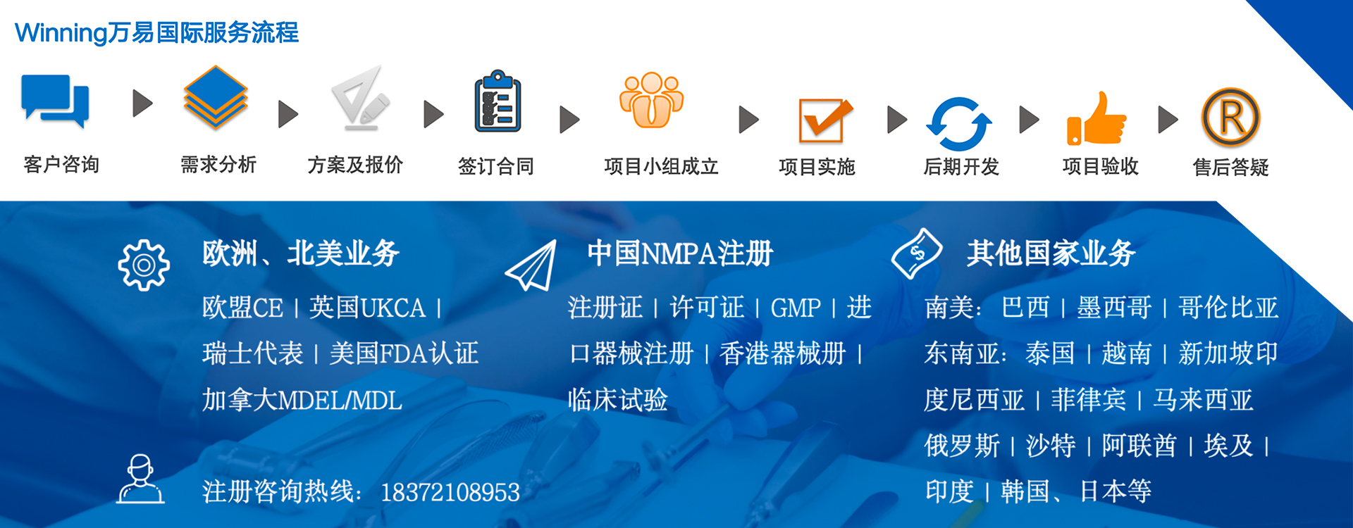 Winning万易集团英文(Winning Group Medical Technology Co.,Ltd)致力于为全球医疗器械企业提供从市场准入规划、GMP体系搭建、注册辅导、临床试验到产品上市后指导的全生命周期一站式技术服务,已形成“覆盖全国、辐射全球”的战略布局。万易国际认证致力于器械全生命周期需求的千余项或功项目经验;覆盖耗材、康复器械、医美、医用成像、外科手术,神经介入、心血管、眼科、人工智能、口腔、骨科植入、呼吸麻醉、透析及体外循环、IVD等医疗器械细分领试